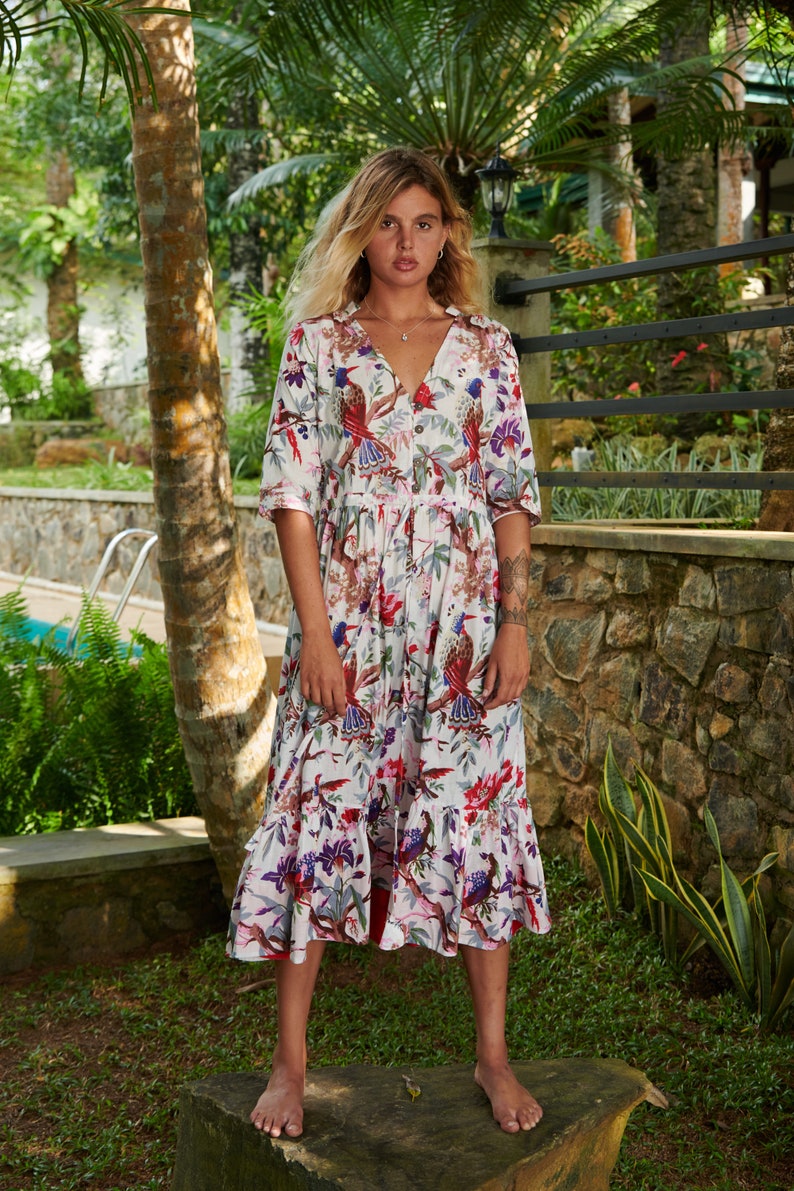 Sukienka zapinana jest na guziki przy szyi, ma rękawy 3/4, ściągacz w talii i ładnie wykończony dół. Wewnętrzny brzeg